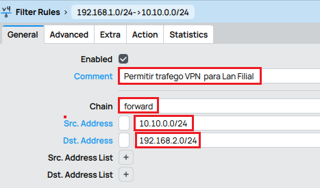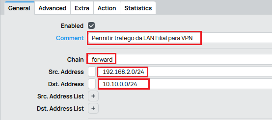 - Adicione uma regra no campo Chain forward para aceitar o tráfego da rede VPN (Src. Address – 10.10.0.0/24) para a rede local da Filial (Dst Address – 192.168.2.0/24).
