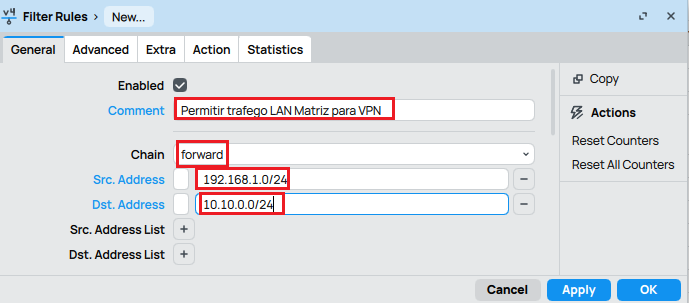 - Adicione uma regra no campo Chain forward para aceitar o tráfego da rede VPN (Src. Address – 10.10.0.0/24) para a rede local da Matriz (Dst Address – 192.168.1.0/24).