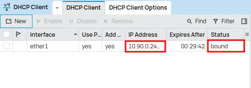 In the ‘DHCP Client’ window: Observe the list of DHCP clients. The status of the DHCP client you just configured should change to bound.
